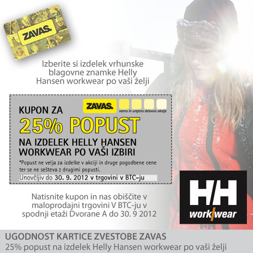 Približuje se čas, ko bodo lahkotna poletna oblačila nadomestila toplejša jesenska in zimska oblačila, zato smo se odločili, da za vas, naše zveste kupce in imetnike KARTICE ZVESTOBE ZAVAS, pripravimo posebno predsezonsko akcijsko ponudbo - 25% popust na izdelek vrhunske blagovne znamke Helly Hansen workwear po vaši izbiri. Ugodnost lahko izkoristite v naši maloprodajni trgovini V BTC-ju v spodnji etaži Dvorane A do 30. 9 2012. Vabimo vas, da natisnete kupon za 25% enkraten popust na izdelek vrhunske blagovne znamke Helly Hansen workwear in ga vnovčite v naši malopodajni trgovini Zavas. |