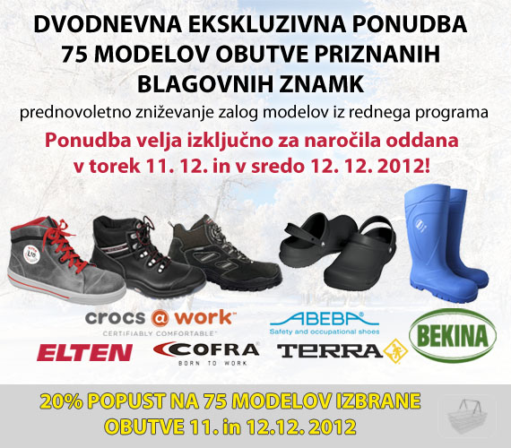 Novo leto prinaša nove začetke. Tudi v podjetju Zavas se počasi poslavljamo od starega, zato smo za vas izbrali kar 75 ekskluzivnih modelov obutve kakovostnih blagovnih znamk Elten, Cofra, Abeba, Crocs work, Bekina in Terra. Tokrat nudimo obutev za zaščito v različnih delovnih okoljih. Elten - vodilni nemški proizvajalec nudi največjo stopnjo ergonomije in udobja Terra - kanadski proizvajalec z 200 letno tradicijo predstavlja atraktivne linije delovne zaščitne obutve, katerih modele odlikuje sodoben športen izgled in kakovostni materiali Cofra - vodilni evropski proizvajalec s 70 letno tradicijo ponuja rešitve za uporabnike, ki iščejo dobro razmerje med ceno in kakovostjo Abeba - kakovostna obutev, ki nudi visoko stopnjo zaščite in optimalno udobje pri delih v gostinstvu, farmaciji, prehrambeni idustriji Crocs work - lojalna in ljubeča tehnologija Croslite, ki vsakemu uporabnku delovne obutve Crocs zagotavlja udobje, protizdrsen podplat in zaprta oblika pa nudita popolno zaščito AKCIJA V TRGOVINI ZAVAS V BTC-ju VELJA ZA NAKUP DNE 11.12. IN 12.12. 2012 ZGOLJ OB PREDLOŽITVI TEGA E-SPOROČILA (velja kot kupon). |