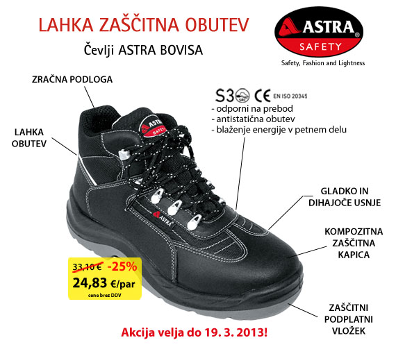 Iz asortimana kakovostne blagovne znamke Astra vam predstavljamo izjemno lahek model zaščitne obutve s kompozitno zaščitno kapico - čevelj Astra BOVISA. Zaščitna obutev Astra Safety je nastala kot posledica ambicioznega industrijskega projekta skupine Battaglia, ki svoja znanja in izkušnje na področju proizvodnje zaščitne obutve razvija že 50 let. Družba je bila v proizvajanju zaščitne obutve uspešna takoj, obutev Astra Safety pa je narejena v skladu z zahtevami evropskih standardov in temelji na filozofiji: kakovost, moč, oblikovanje in zadovoljstvo strank. Zaščitna obutev Astra Safety je tako s široko paleto izdelkov enostavno dosegla pomembno vlogo kot proizvajalec zaščitne obutve v več kot 25-ih državah po vsem svetu.
