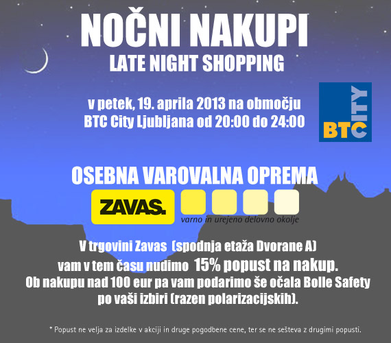 Združite prijetno s koristnim in izkoristite petkove Nočne nakupe v BTC City Ljubljana. Trgovine bodo odprte kar do polnoči! Petkov večer tako lahko izkoristite za nakupe za katere med tednom zmanjka časa, se odpravite v kino ali na kozarček s prijatelji. Za vas, naše kupce, smo v petek, 19. 4. 2013 v času Nočnih nakupov v BTC City Ljubljana pripravili kar 15% popust na nakup. Popust velja zgolj za nakupe v trgovini ZAVAS v BTCju (spodnja etaža Dvorane A) v petek, 19. 4. 2013 med 20:00 in 24:00 uro. Ob nakupu nad 100 eur pa si v tem času lahko iz pestre ponudbe očal Bolle Safety brezplačno izberete en kos zaščitnih očal (razen polarizacijskih).