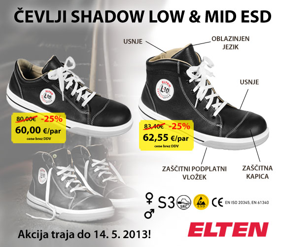 Čevlje vodilnega nemškega proizvajalca ELTEN uvrščamo med tiste, ki nudijo največjo stopnjo ergonomije in udobja. Kolekcija L10 pa se ponaša še s privlačnim urbanim dizajnom in varnostjo, ki jo nudi posebna zaščitna kapica. Modno in udobno obutev si lahko do 14. 5. 2013 zagotovite s kar 25% popustom!