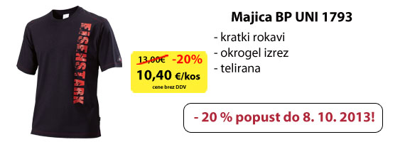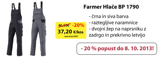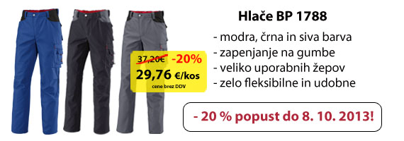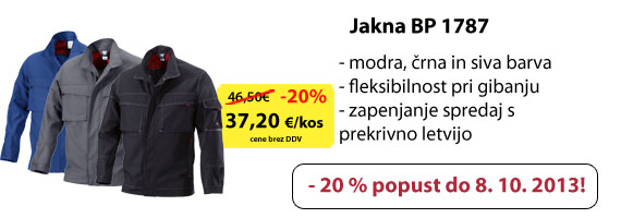 Moč in uspeh - ime BP kolekcije BPerformance pove vse: kot športna rešitev na različnih področjih uporabe vam oblačila BPerformance nudijo odličen izgled v treh fantastičnih barvnih kombinacijah. Visokokakovostna izdelava in robustna platnena tkanina zagotavljata vzdržljivost oblačil, ergonomsko prileganje in ogromno praktičnih detajlov pa vam nudi udobje in svobodno gibanje pri vašem delu. Zagotovite si popoln, moden in udoben komplet delovnih oblačil. Za vas smo iz celotnega asortimana izbrali delovne hlače, farmer hlače in pripadajočo jakno, vse to pa vam do 8. 10. 2013 ponujamo z 20% popustom.