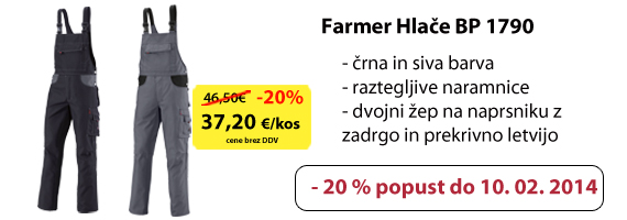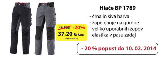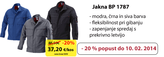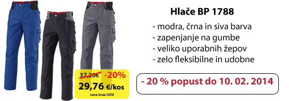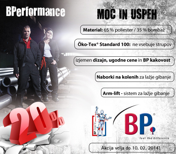 Moč in uspeh - ime BP kolekcije BPerformance pove vse: na različnih področjih uporabe vam oblačila BPerformance nudijo odličen izgled v treh fantastičnih barvnih kombinacijah. Visokokakovostna izdelava in robustna platnena tkanina zagotavljata vzdržljivost oblačil, ergonomsko prileganje in ogromno praktičnih detajlov pa vam nudi udobje in svobodno gibanje pri vašem delu. Zagotovite si popoln, moden in udoben komplet delovnih oblačil. Za vas smo iz celotnega asortimana izbrali delovne hlače, farmer hlače in pripadajočo jakno, vse to pa vam do 10.02.2014 ponujamo z 20% popustom.