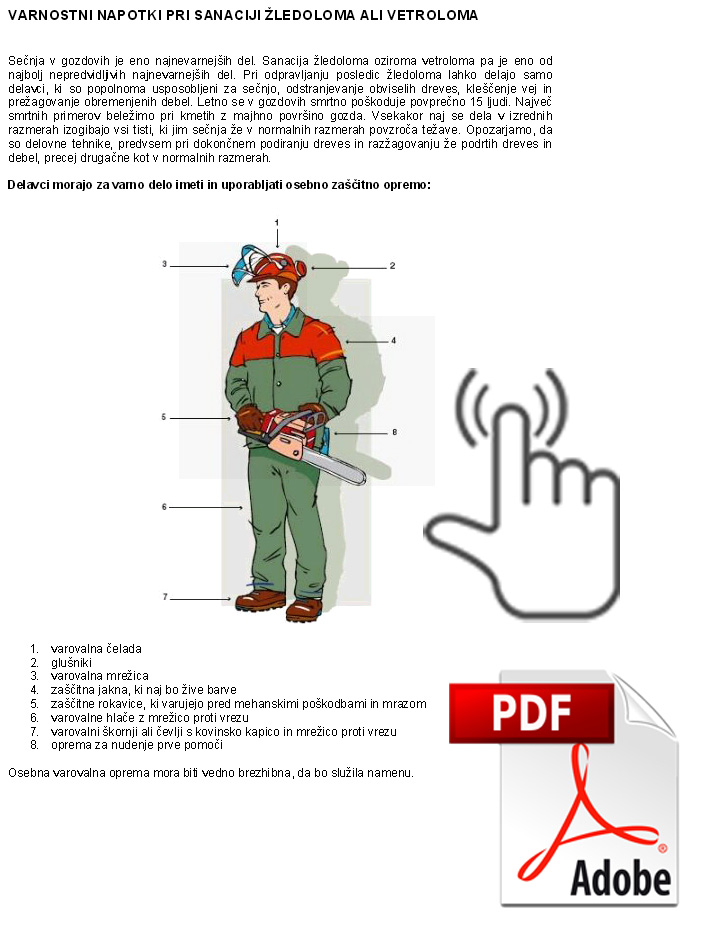 | S strani Društva varnostnih inženirjev Ljubljana, smo prejeli NAVODILA ZA VARNO DELO V GOZDU, ki so jih pripravili na Inštitutu RS za delo in jih posredujemo tudi vam. | Za varno delo v gozdu, vam nudimo profesionalno gozdarsko opremo po ugodnih cenah v naši spletni trgovini www.zavas.com: GOZDARSKA OPREMA. | Celotno kolekcijo gozdarske opreme si lahko ogledate tudi v elektronski obliki. |