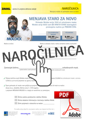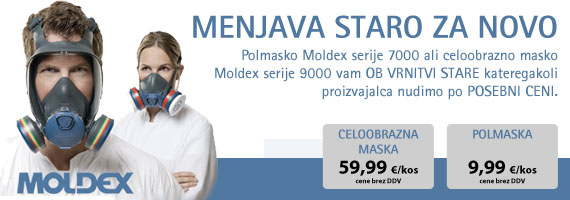 Ob vrnitvi vaše stare celoobrazne dihalne maske ali dihalne polmaske, vam nudimo novo Moldex celoobrazno masko 9000 po ceni 59,99€/kos+ddv ali novo polmasko Moldex 7000 po ceni 9,99€/kos+ddv.