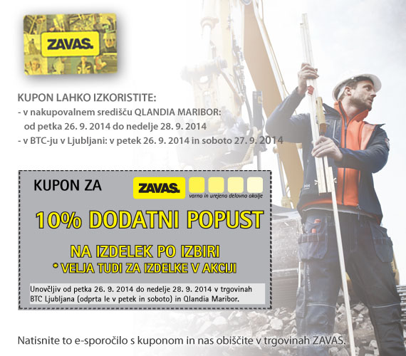 Obiščite nas v naših trgovinah in si izberite izdelek po vaši izbiri, na katerega vam ob predložitvi kupona nudimo kar 10% dodatni popust. popust velja tudi za izdelke v akcij, Izbirate lahko med široko in pestro ponudbo osebne varovalne opreme vrhunskih proizvajalcev. Lepo vabljeni!