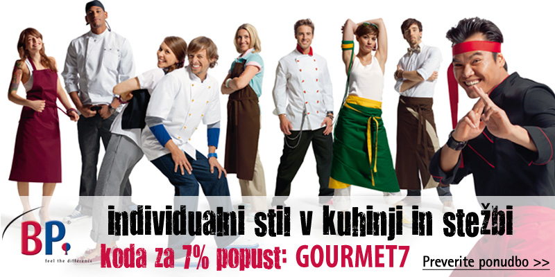 BP GOURMET - Oblačila za kuhinjo in strežbo. Izbirajte med pestro ponudbo kuharskih jaken, hlač, predpasnikov, kap, rut ter ostalih dodatkov za delo v kuhinji in strežbi. Barvna paleta v enajstih barvnih različicah nudi sodobne kombinacije za usklajeno delovno podobo. Izredno trpežni in udobni materiali ter kroji.