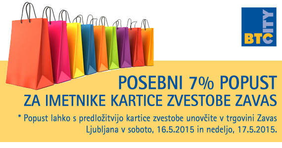 Vabimo pa vas tudi, da se nam pridružite v trgovini Zavas v spodnji etaži dvorane A in izkoristite dodaten 7% popust, ki velja tudi za akcijske cene le za imetnike kartice zvestobe Zavas.