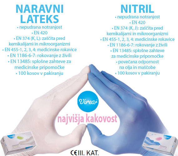 Na podlagi zelo zadovoljnih uporabniških izkušenj naših strank vam priporočamo VIREO - visokokakovostne zaščitne rokavice za enkratno uporabo klasificiranje po najvišjih varnostnih  standardih (III. kategorija) za delo v zdravstvu, farmacevtski in živilski industriji.