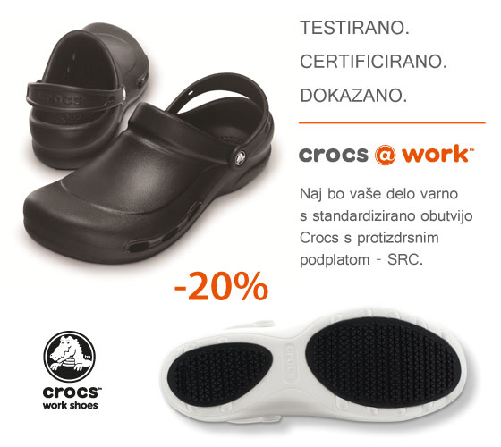 Da bo vaše delo in delo vaših zaposlenih varno, smo za vas pripravili akcijo delovne obutve Crocs Work. Izkoristite - 20% popust in si zagotovite standardizirano obutev z zanesljivim protizdrsnim podplatom.