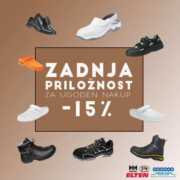 V posebni ponudbi lahko izbirate med sandali, natikači, čevlji in škornji priznanih blagovnih znamk Abeba, Jolly, Cosmas, Elten ter Helly Hansen. Nizka teža, protizdrsni podplati, anatomsko oblikovani notranji vložki, prvovrstni vgrajeni materiali ter številne druge prednosti čevljev omenjenih proizvajalcev nudijo največjo podporo stopalu oz. nogam pri delu.