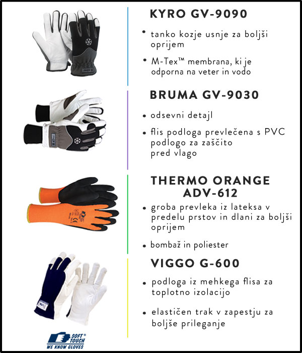 ZAŠČITNE ROKAVICERokavice za fina mehanska delaRokavice za groba mehanska delaRokavice za protiurezno zaščitoUsnjene in tehnične rokavice za mehansko zaščitoRokavice za zaščito pred minimalnimi rizikiTemperaturno odporne zaščitne rokaviceVarilske rokaviceRokavice za zaščito pred mrazomRokavice za zaščito pred vibracijamiRokavice za enkratno uporaboRokavice za zaščito pred neagresivnimi tekočinamiRokavice za živilsko industrijoRokavice za zaščito pred kemikalijamiRokavice za zaščito pri delu pod elektr.napetostjoDodatki za zaščito rok