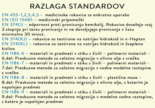 Ker se rokavice za enkratno uporabo pogosto uporabljajo pri rokovanju z živili, kot zaščita pred kemikalijami in mikroorganizmi ter v medicinske namene so v spodnji sliki prikazani standardi, ki jih imajo VIREA LATEX in VIREA NITRIL zaščitne rokavice.