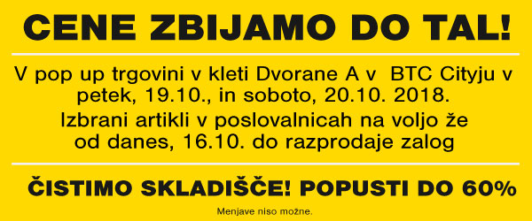 Širok izbor izdelkov s popusti do 60% lahko najdete v naši pop up trgovini v kleti Dvorane A v BTC Cityju na FNZ-ju v petek, 19. 10., in soboto, 20.10. 10. 2018.
