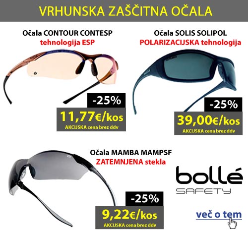 | Na zalogi je preko 60 različnh očal Bolle Safety, na izbrane modele pa vam do 30. 6. 2012 nudimo 25% popust. Sporočamo vam, da se je v naša e-obvestila prikradla napakica v zvezi s popustom, saj smo vas obvestili, da je popust na očala 15%, NUDIMO PA VAM 25% POPUST. Za nastalo napako se vam opravičujemo! TEHNOLOGIJA POLARIZED Sončna svetloba je večsmerna. Ko se odbije od ravne površine (voda, cesta, vetrobransko steklo) se os nihanja spremeni v polarizirano svetlobo. Močna svetloba nemudoma povzroči neugodje in zmanjša zaznavanje in kontrast ter povzroči solzenje, motnjo vida in utrujenost. Polarizacijska očala vsebujejo polarizacijski filter, ki odstrani bleščanje, izboljša zazanavanje barv, izboljša zaznavanje kontrasta, odpravi utrujenost in izboljša udobje. TEHNOLOGIJA ESP Modra svetloba je je 10 krat močnejša od rdeče. Žarki modre svetlobe se razpršijo v vse smeri in poškodujejo očesno mrežnico. Posledice izpostavljenosti modri svetlobi so: zmanjšanje vidne ostrine, izguba razločevanja barv, oslepitev, utrujenost in glavobol, zabrisan vid.Očala s tehnologijo ESP vsebujejo filter, ki zaustavi 70% modre svetlobe, 63% vidne in 100% UVB/UVA svetlobe. ![]() Aktualno tudi - Mesečnik Maj 2012 - Pomladne akcijske cene.pdf Maloprodajna trgovina Zavas je na NOVI LOKACIJI! Preselili smo se v spodnjo etažo hale A, vhod A6, BTC Ljubljana Obiščite nas na novi lokaciji, BTC Ljubljana, HALA A (vhod A) s spodnjim kuponom in izkoristite 5% popust na vse veljavne cene. ![]() | |||