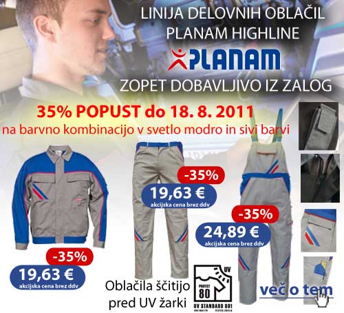 Najbolj prodajane delovne obleke Planam kolekcije Highline ponovno na zalogi. Izkoristite 35% popust na izbrano kolekcijo v svetlo modro sivi barvi!