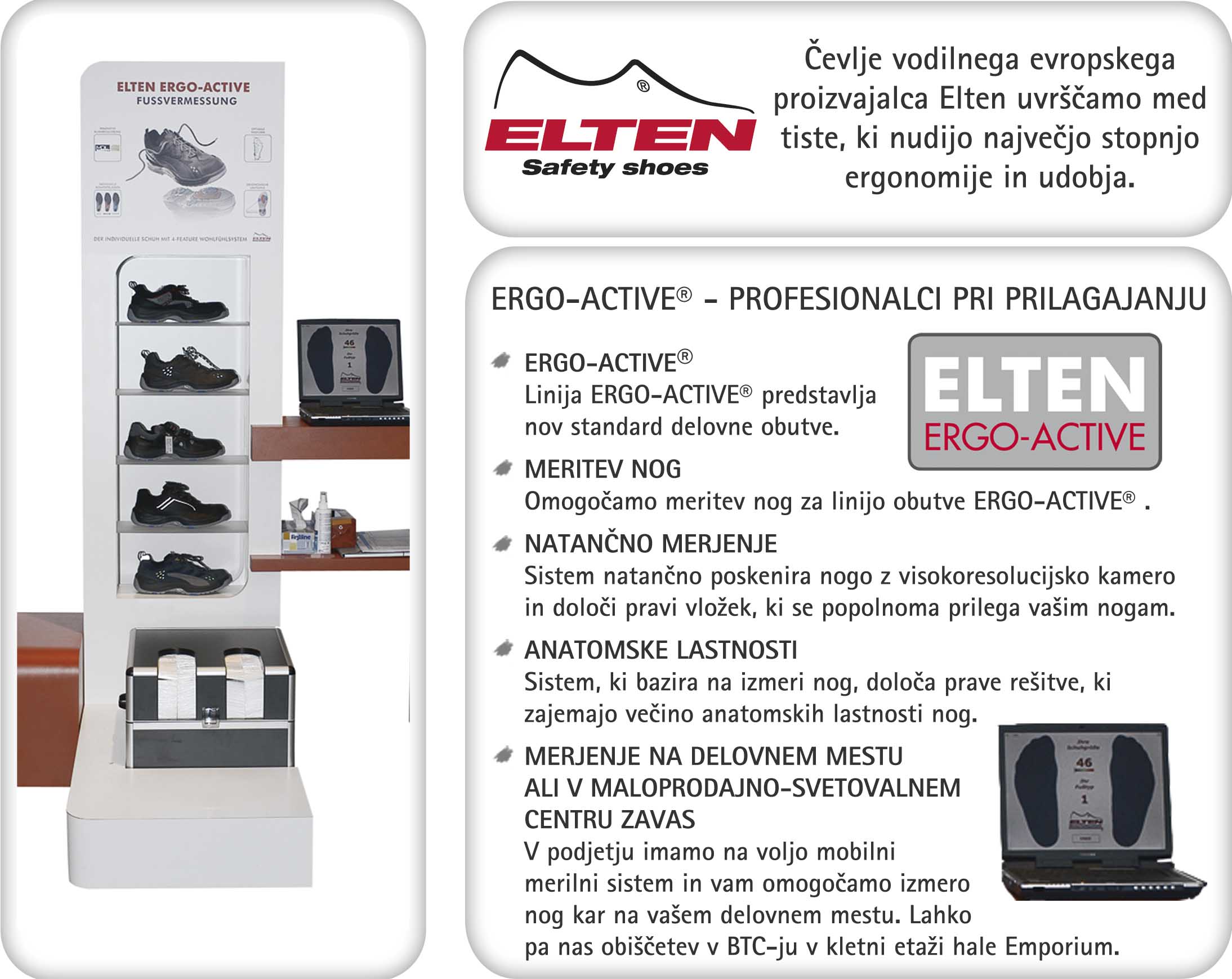 ERGO-ACTIVE® TEHNOLOGIJA ZA VASVodilni evropski proizvajalec zaščitne obutve Elten je razvil inovativen sistem za izmero in določitev pravilne obutve za vsakega posameznika. Linija ERGO-ACTIVE® predstavlja nov standard delovne obutve. Uporabniku se poskenira stopala in na podlagi tega izbere ustrezen tip obutve. S tem je zagotavljena izjemna varnost in udobje. Vabimo vas, da obiščete maloprodajno-svetovalni center Zavas v kletni etaži hale Emporium v BTC-ju in tehnologijo preizkusite na lastnih nogah!