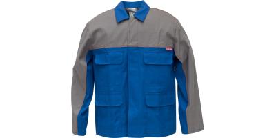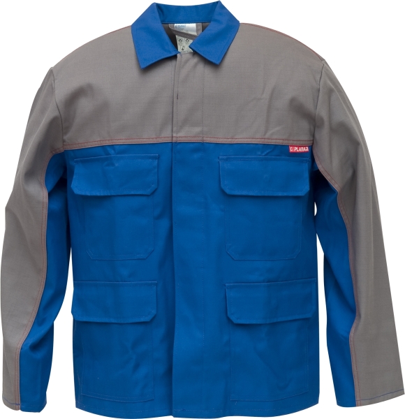 Kakovostna zaščtna ognjeodbojna in antistatična jakna, zaščita pred varilskimi iskrami, zapenjanje na gumbe, sprednja žepa s prekrivno letvijo in prsna žepa s prekrivno letvijo