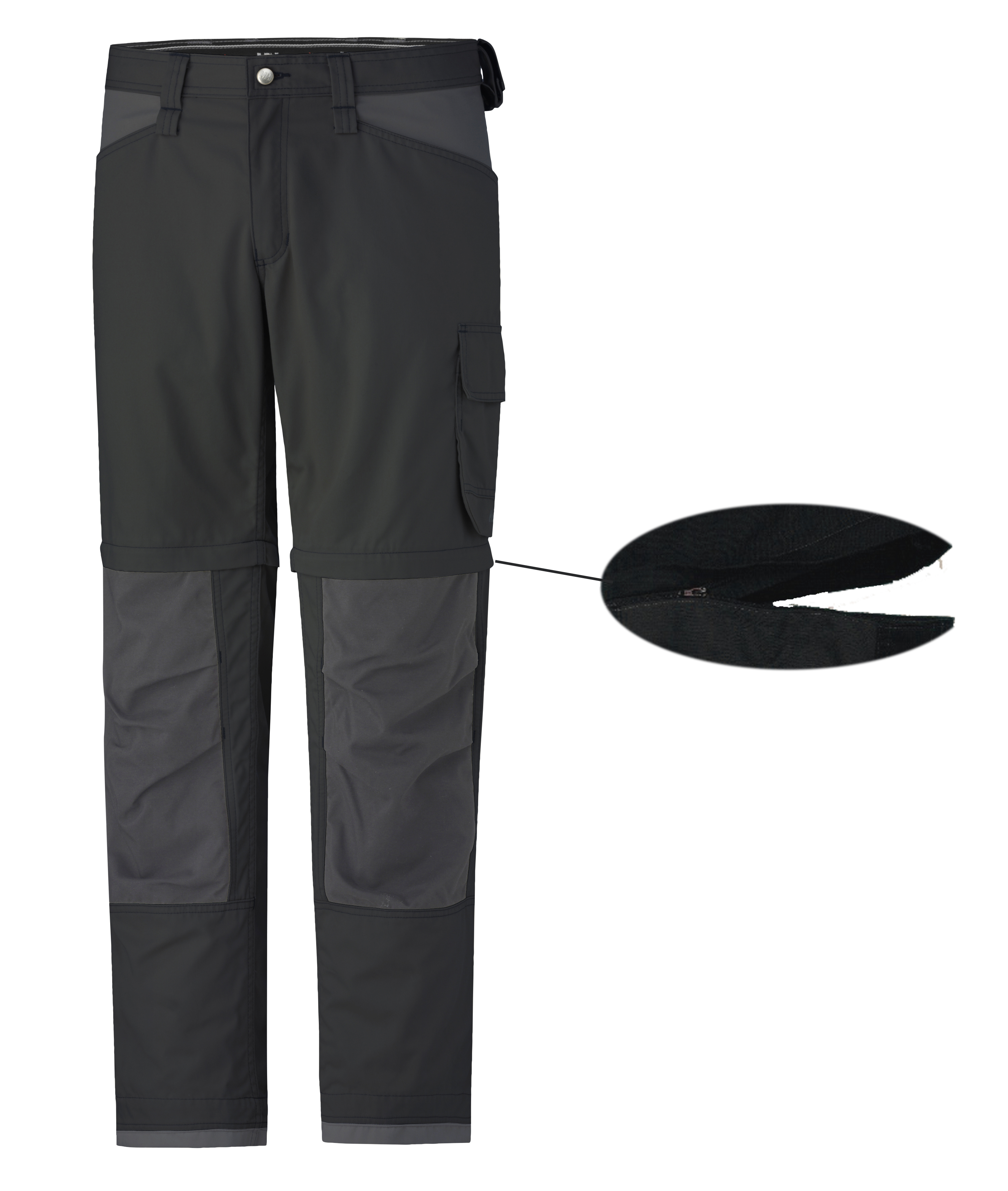 Dva viseča žepa za orodje z dvojnim dnom in zankami za orodje, zanke za pas, dva stranska žepa, 5 cm tkanine na dnu hlačnic daje možnost podaljšnja hlač (v velikost C100), dva zadnja žepa (en s sprimnim trakom), stranska žepa na hlačnicah, notranja žepa za ščitnike kolen, ločljive hlačnice s pomočjo zadrge