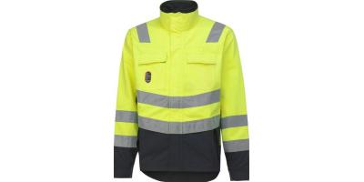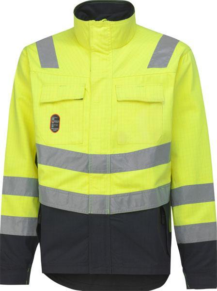 Ognjeodbojna in antistatična jakna, zapenjanje z zadrgo in prekrivno letvijo, stranska žepa z zadrgo in prekrivno letvijo, prsna žepa s prekrivno letvijo in sprimnim trakom, podaljšan hrbtni del, krojeni komolci, zanka za pripenjanje ID kartice, odsevniki