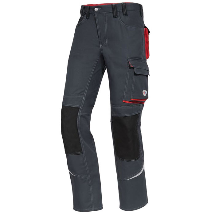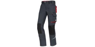 Delovne hlače na pas, prednje zapenjanje s pomočjo gumba, elastika v zadnjem delu pasu za boljše prileganje in večje udobje, zanke za pas, D-obroč za pritrditev dodatkov, dva stranska žepa, dva zadnja žepa s pritiskači in poklopcem, zanka za kladivo, prostoren žep na levi hlačnici z žepom za mobilni telefon,dvojni žep za ravnilo, odsevniki, ergonomičen kroj hlačnic v predelu kolen omogoča večjo fleksibilnost in udobje, primerne za industrijsko pranje (do