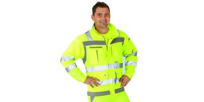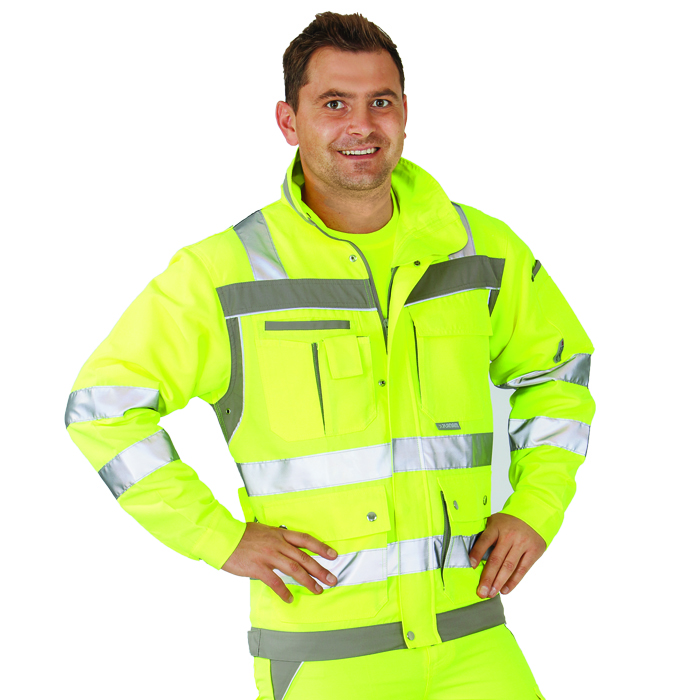 Dobro vidna jakna, prednje zapenjanje z zadrgo in prekrivno letvijo, stranska žepa s prekrivno letvijo in pritiskači, levi prsni žep s prekrivno letvijo in sprimnim trakom, dvojni desni prsni žep, žep za mobilni telefon, žep na levem rokavu, dve zanki za pisalo, prilagajanje širine v zapestju s pritiskači, nastavljiv obseg pasu s sprimnim trakom, razporki na hrtu omogočajo prosto gibanje rok, prezračevalna reža na hrbtu, odsevniki spredaj in zadaj