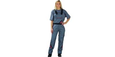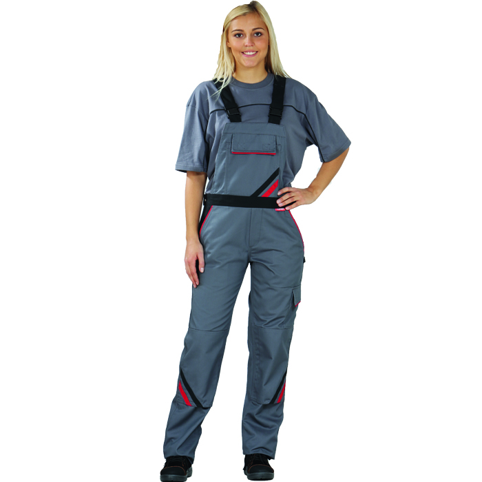 Ženske farmer hlače namenjene za varovanje pred umazanijo in prahom, lahko vzdrževanje, dolga življenjska doba, ženski kroj, zapenjanje z zadrgo, stranska žepa, žepa za kolenčnike, stranski žep s prekrivno letvijo in sprimnim trakom na levi hlačnici, naprsni žep s prekrivno letvijo in sprimnim trakom, zadnja žepa s prekrivno letvijo in sprimnim trakom, nastavljiv obseg pasu s pomočjo pritiskačev, elastične v pasu, visok hrbtni del z naramnicami, elastične naramnice s sponkama za nastavitev dolžine, dvojni žep za ravnilo, zanka za kladivo