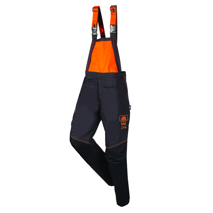 Vodoodbojne in dobro vidne gozdarske farmer hlače, zadrga spredaj, prednja žepa, zapiranje na desni strani z zadrgo in gumbom, žep za merilno opremo in pritrditev ključa za vžigalne svečke, elastične nastavljive naramnice s sponko, elastičen pas, naprsni žep z navpično zadrgo na desni strani, 6-slojni prednji zaščitni vložek, zaščita pred urezom z motorno žago, odporne na umazanijo