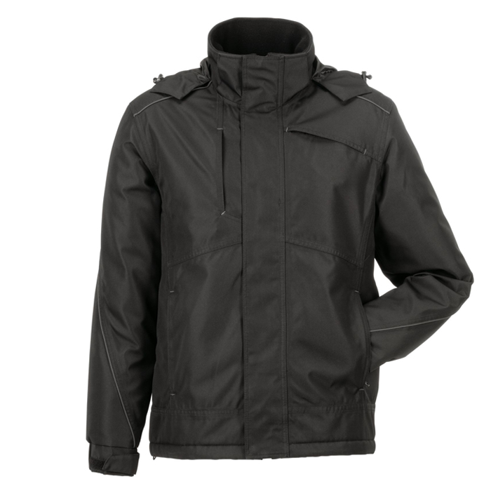 Vodoodporna bunda, lepljeni šivi, zapenjanje s pomočjo zadrge skrite s prekrivno letvijo s pritiskači, stranska žepa z zadrgo, dva prsna žepa z zadrgo, notranji žep, odsevna obroba čez hrbet in rokave, prilagodljiva rokava s sprimnim trakom, prilagodljiva v pasu z vrvico na poteg, v ovratnik zložena kapuca