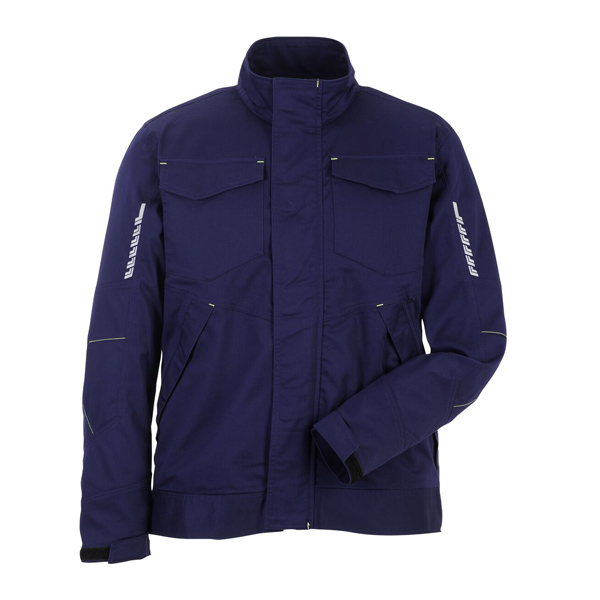 Delovna jakna z zapiranjem na zadrgo s prekrivno letvijo na sprimni trak, dva stranska žepa z zapiranjem na zadrgo s prekrivno letvijo na sprimni trak, dva prsna žepa s poklopcem na sprimni trak, odsevni elementi na rokavih in hrbtu, visok ovratnik z zaščito za brado, prilagajanje širine v zapestjih s sprimnim trakom.
